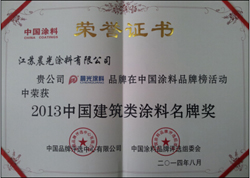 8月27日,“2013中国涂料品牌榜”揭晓。江苏壹号娱乐-com - NG大舞台,有梦你就来涂料有限公司凭借在品牌知名度、创新力等方面的优秀表现,一举斩获中国建筑类涂料名牌奖这项大奖。图为江苏壹号娱乐-com - NG大舞台,有梦你就来涂料有限公司此次颁奖获得的荣誉证书。